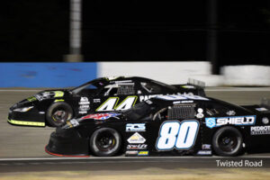 Coquille, Oregon’s David Miller made an exciting maneuver with just three laps remaining to take Saturday’s 125-lap Super Late Model feature at Shasta Speedway. Miller’s win in the fourth round of action tightens the championship battle considerably with one race remaining. Photo by Twisted Road Photography